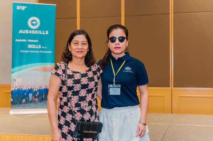 Yến Anh và mẹ, bà Hồ Thị Ân, tại lễ Chào mừng các cựu sinh viên Học bổng chính phủ Australia hôm 19/8 tại Hà Nội. Ảnh: Aus4Skills