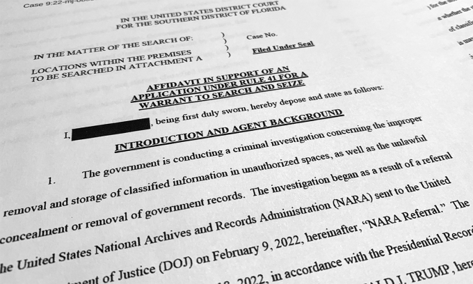 Phần mở đầu tờ tŕnh xin lệnh khám dinh thự Mar-a-Lago của cựu tổng thống Mỹ Donald Trump được công bố ngày 26/8. Ảnh: AP.