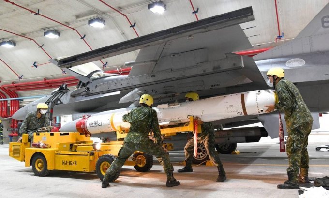 Kỹ thuật viên lắp tên lửa Harpoon cho tiêm kích F-16 trong ảnh do Đài Loan công bố hôm 26/7. Ảnh: Lực lượng phòng vệ Đài Loan.