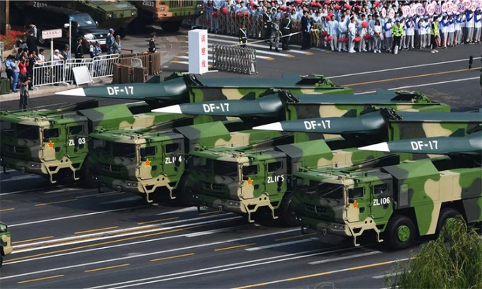 Tên lửa siêu vượt âm DF-17 trong lễ duyệt binh tại Bắc Kinh, Trung Quốc, tháng 10/2019. Ảnh: PLA.