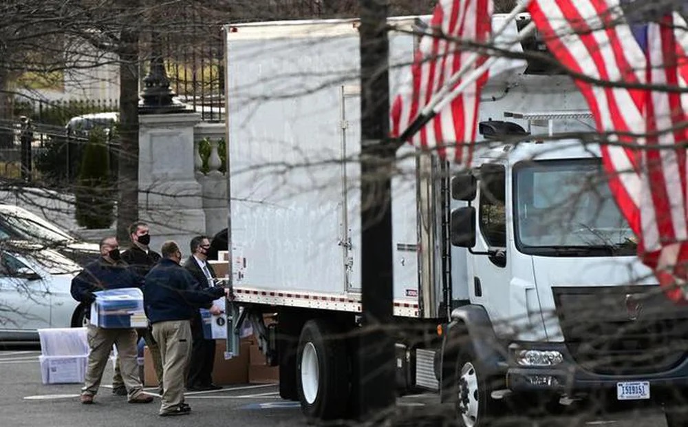 Xe tải chuyển đồ xuất hiện bên ngoài Nhà Trắng khi các nhân viên bắt đầu dọn dẹp đồ đạc hồi tháng 1-2021. Ảnh: Reuters
