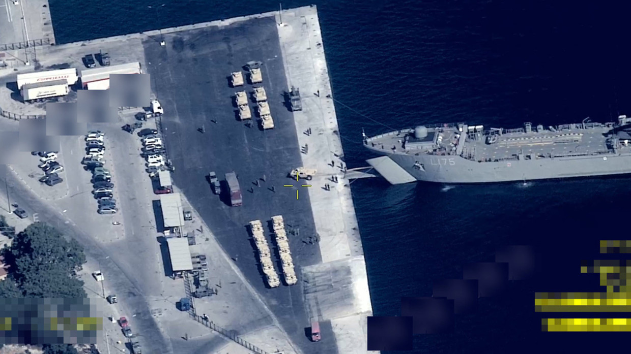 Ảnh vệ tinh do Bộ Quốc phòng Thổ Nhĩ Kỳ công bố, cho thấy cảnh các xe quân sự xếp thành hàng tại một bến cảng với một tàu đổ bộ neo ở gần đó, khoang chứa hàng vẫn đang mở.