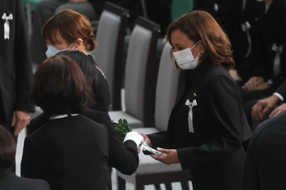 Phó tổng thống Mỹ Kamala Harris đặt hoa viếng ông Abe. Bà đang thực hiện chuyến thăm Nhật Bản dài 4 ngày, từ ngày 26/9.