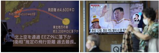 Các bản tin ở Tokyo và Seoul về việc Triều Tiên bắn tên lửa đạn đạo qua Nhật Bản ngày 4/10. Ảnh: Reuters/AP.