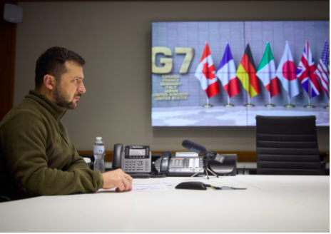 Tổng thống Ukraine Volodymyr Zelensky trong cuộc họp với lănh đạo G7. Ảnh: KP