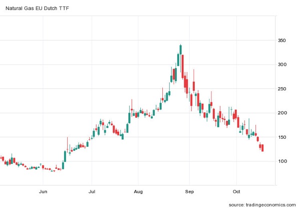 Một thời giá khí đốt cao tới mức 350 euro/MWh (tức khoảng 3565 USD/1000m3). Giá ngày 18/10 đă về mức 120 euro.