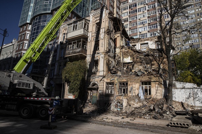 Tòa nhà bị phá hủy sau cuộc tấn công bằng UAV nhằm vào Kiev, Ukraine, hôm 18/10. Ảnh: AFP.