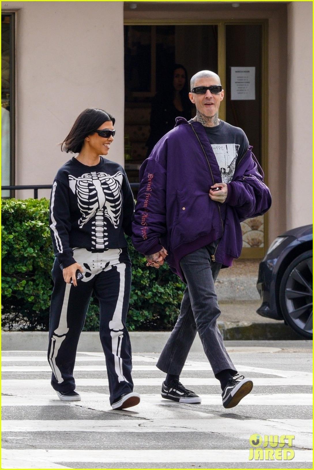 Chị gái Kim Kardashian cắt tóc ngắn trẻ trung, lên đồ cá tính với họa tiết hình xương ra phố. Còn Travis Barker lại diện áo phao, quần jeans năng động.