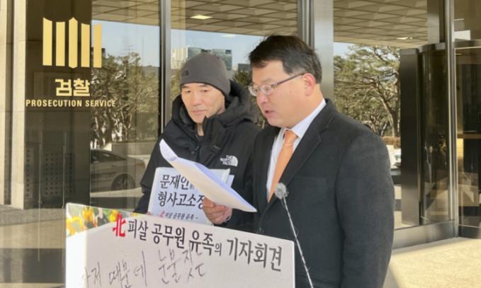 Lee Rae-jin (trái), anh trai của quan chức ngư nghiệp Lee Dae-jun, cùng luật sư bên ngoài văn pḥng công tố ở Seoul, Hàn Quốc, ngày 14/12. Ảnh: Korea Herald.