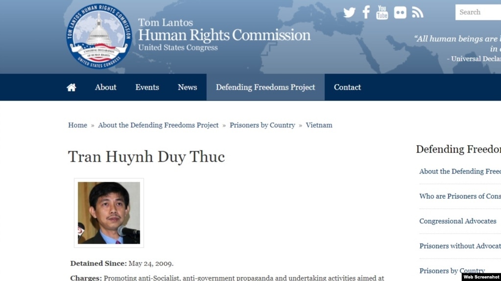 Uỷ ban Nhân quyền Tom Lantos đăng hồ sơ của ông Trần Huỳnh Duy Thức trên trang web. Photo Tom Lantos Human Rights Commission.