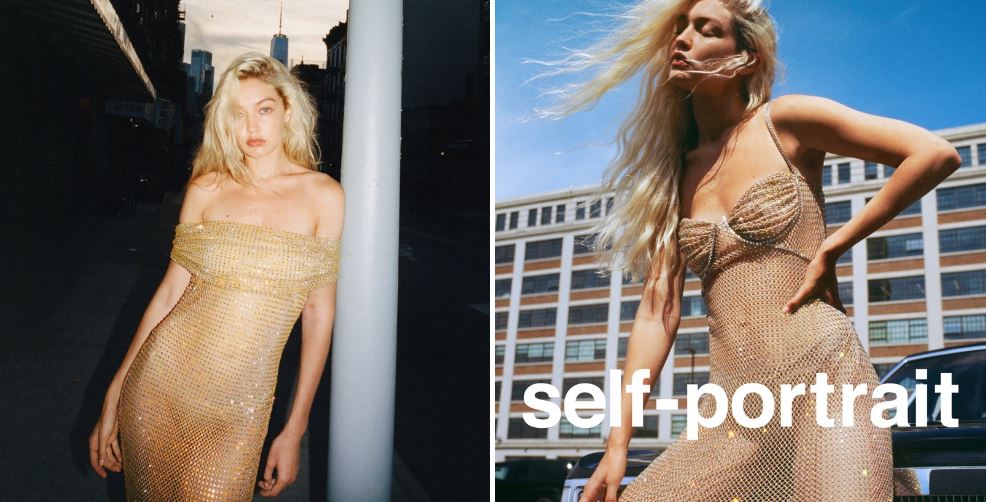 Trước đó, Gigi Hadid cũng xuất hiện trong chiến dịch Self-Portrait Pre-Spring 2023 với chiếc váy dệt kim xuyên thấu. Mẫu váy trễ vai ánh bạc phù hợp với dáng người đồng hồ cát của nữ người mẫu.