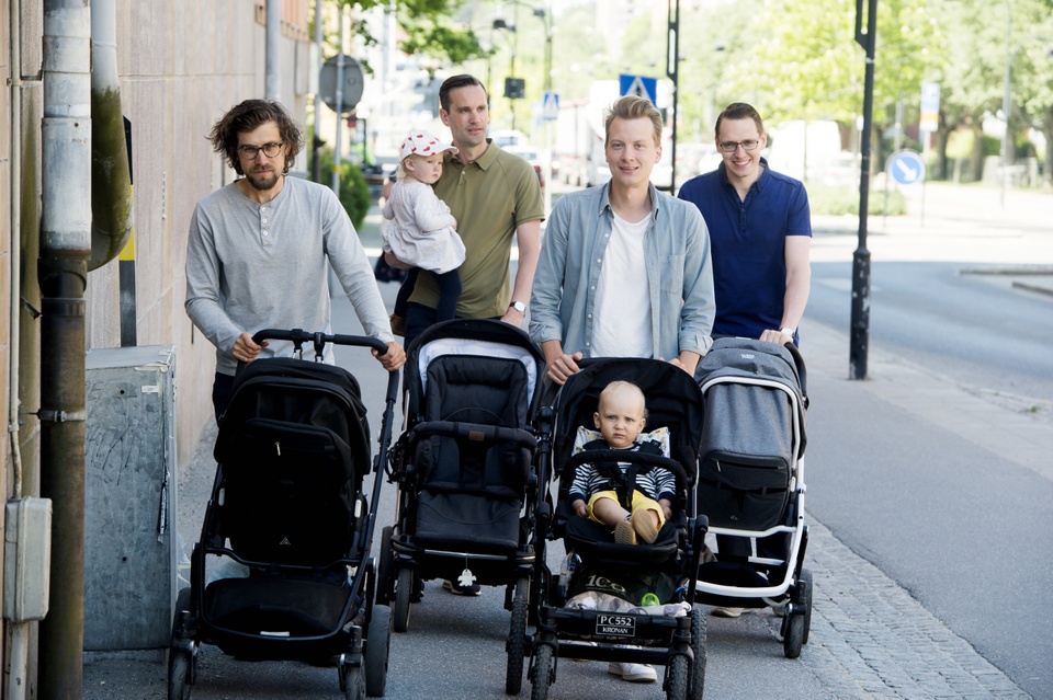 Hai người bố đẩy xe nôi, cầm cốc cà phê và cùng tṛ chuyện ở Thụy Điển. Ảnh: Sweden.se.