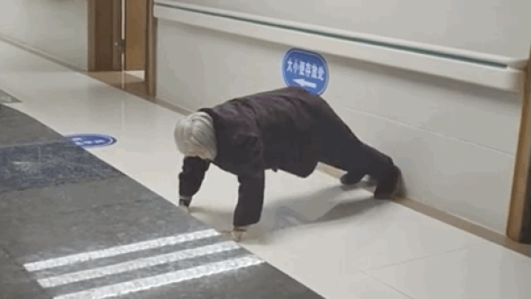 Cụ bà chống đẩy ở hành lang bệnh viện để "có sức chăm chồng". Ảnh: Weibo.