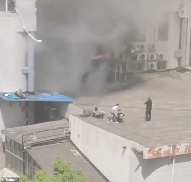 Những người thoát được trận hỏa hoạn bằng cách nhảy xuống phần mái chìa ra của tòa nhà trong Bệnh viện Trường Phong, Bắc Kinh chiều 18/4. Ảnh: Twitter