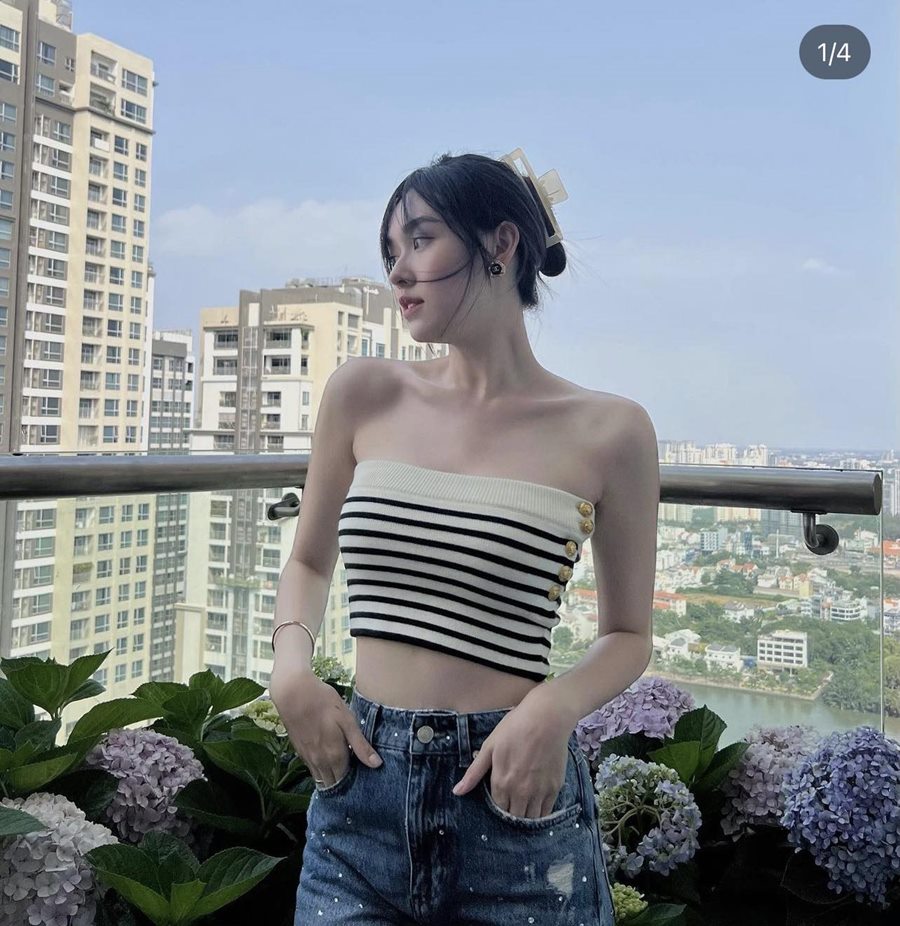 Á hậu Tường San sinh năm 2000, cô cao 1m71, số đo 3 vòng 82 – 62 – 95cm. Sau sinh, cô dường như về lại dáng tiệm cận với tỷ lệ cơ thể khi thi sắc đẹp. Nhất là phần vai thon, xương quai xanh quyến rũ được Tường San khoe khéo qua nhiều trang phục khác nhau.