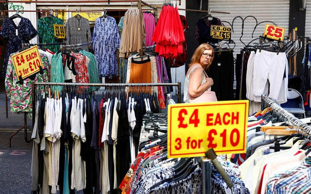 Một người phụ nữ đi dọc chợ phố Petticoat Lane, nơi bán quần áo giảm giá ở London, ngày 23/8. Ảnh: Reuters