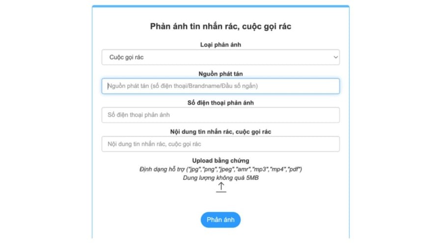 - Bước 4: Upload bằng chứng là ảnh chụp màn hình tin nhắn rác hoặc file ghi âm cuộc gọi rác.