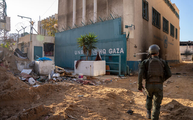 Đại tá Benny Aharon bước vào trụ sở của UNRWA ở thành phố Gaza, ngày 8 tháng 2 năm 2024. (Emanuel Fabian/Times of Israel)