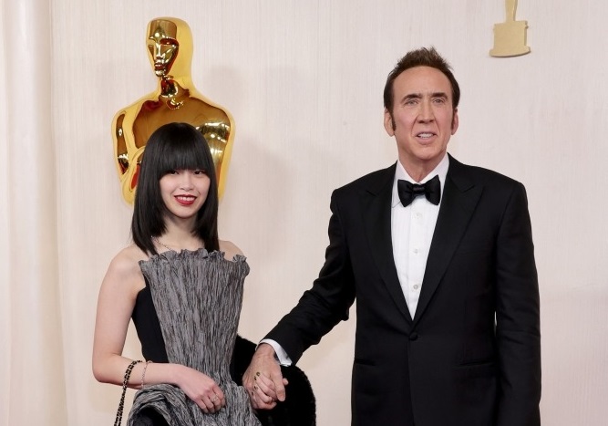 Tài tử Nicolas Cage và người vợ thứ năm Riko Shibata, người Nhật Bản, tay trong tay lên thảm đỏ Oscar 2024.
