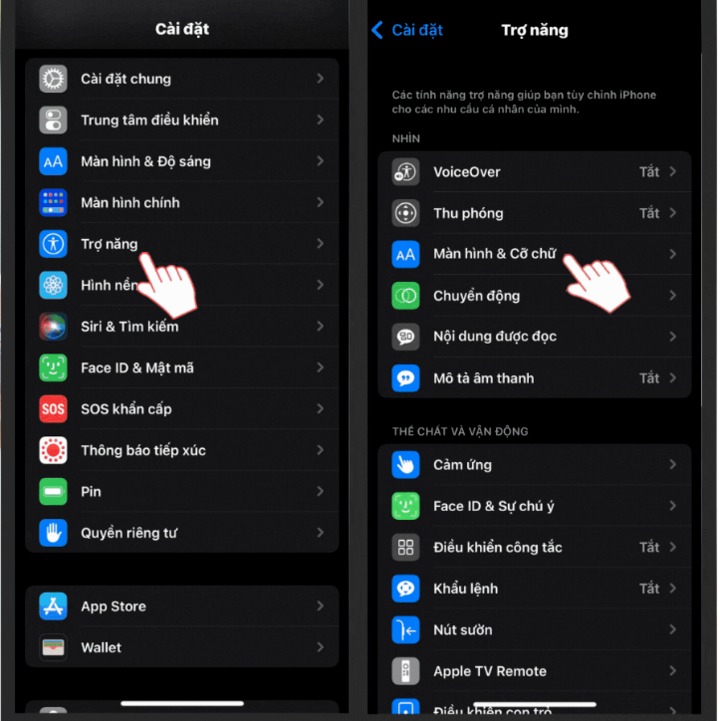Bước 1: Bạn truy cập vào "Cài đặt" chọn "Trợ năng" chọn "Màn hình & Cỡ chữ"