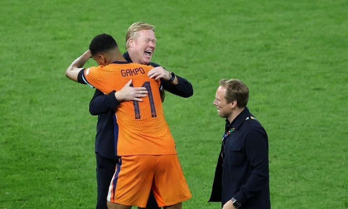 HLV Koeman ôm Gakpo mừng sau khi Hà Lan thắng Thổ Nhĩ Kỳ ở tứ kết Euro 2024. Ảnh: KNVB