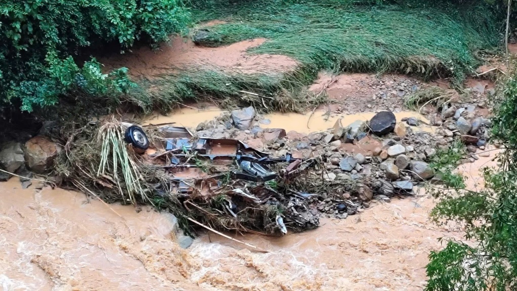 Xe 5 chỗ bị lũ quét cuốn xa gần 3 km biến dạng hoàn toàn. Ảnh: Group địa chất