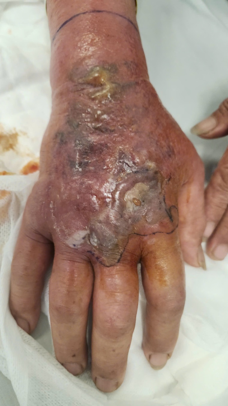 Một bàn tay sưng phồng, hoại tử của bệnh nhân bị rắn hổ mang cắn ngay trong đêm bão (7/9) đang điều trị tại Trung tâm Chống độc, Bệnh viện Bạch Mai. Ảnh BVCC