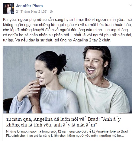 Trước đó không lâu, rất nhiều người cho rằng cô có mượn chuyện của Angelina để nói về tình cảm của mình khi Hoa hậu cập nhập trạng thái: "Khi yêu, người phụ nữ sẽ sẵn sàng hy sinh mọi thứ vì người mình yêu....sẽ không ngần ngại nói những lời ngọt ngào và vẽ ra một bức tranh hoàn hảo, che lấp đi những khuyết điểm về người đàn ông của mình...nhưng không có nghĩa họ sẽ chấp nhận sự phản bội....nhất là với người phụ nữ hiện đại, tự lập. Và nếu đây là sự thật, tôi ủng hộ Angelina 2 tay 2 chân".