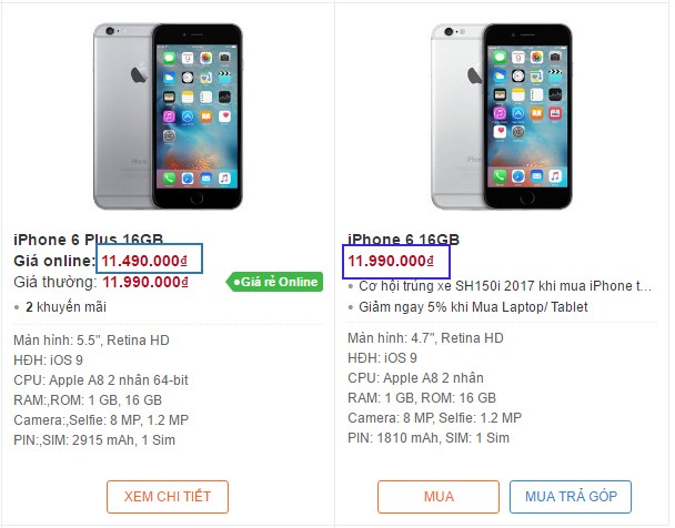Thế nhưng nhiều nhà bán lẻ trong nước lại đang bán iPhone 6 Plus chính hãng với giá 11,49 triệu đồng với hình thức mua hàng online, qua đó rẻ hơn 500,000 đồng nếu mua iPhone 6 với giá 11,99 triệu đồng.