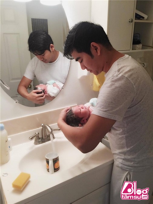 Từ việc tắm rửa, thay tã, thức trắng đêm chăm con để vợ có thời gian nghỉ ngơi, đến việc đi chợ, nấu cơm cho Ngọc Lan ông xã Thanh Bình cũng không hề ngại ngần.