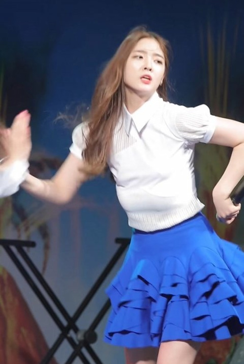 Eunjin nhận ra sự cố và tranh thủ đưa tay chỉnh áo vào những lúc ngưng nhảy.