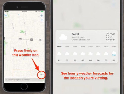 Đây là một trong những tính năng hữu ích nhất trên phiên bản hệ điều hành mới iOS 10.3. Để sử dụng tính năng này, người dùng cần vào ứng dụng Maps của Apple, nhấn tìm kiếm vị trí và nhấn giữ biểu tượng thời tiết ở góc dưới, bên phải màn hình.