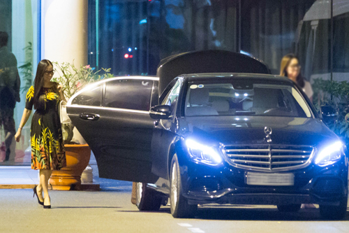 Hà Phương diện váy họa tiết hoa lá khi xuất hiện tại cổng VIP của sân bay Tân Sơn Nhất. Một nguồn tin tiết lộ chiếc phi cơ riêng của gia đình cô có mã hiệu 909 AD. Trong đó, AD là viết tắt của Angelina và Diana - tên hai con gái của cô.