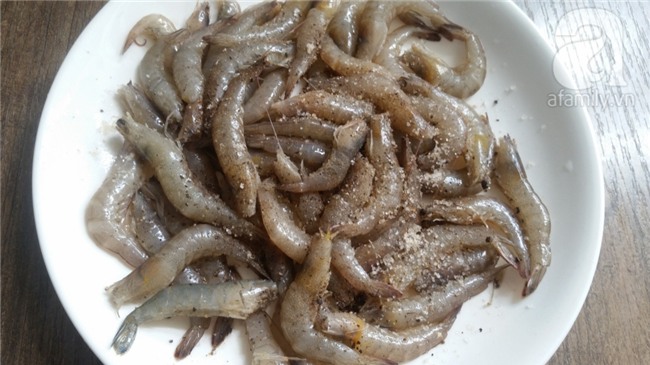 Tôm cắt bỏ râu, rửa sạch, để ráo nước. Sau đó tẩm ướp chút gia vị để khoảng 10 phút cho tôm ngấm.