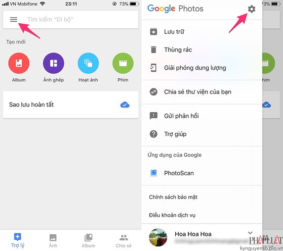 Để đẩy hình ảnh lên đám mây, bạn hãy cài đặt ứng dụng Google Photos cho smartphone thông qua Google Play hoặc App Store. Khi hoàn tất, mở ứng dụng và đăng nhập bằng tài khoản Google tương ứng. Tiếp theo, truy cập vào menu ứng dụng và bấm vào biểu tượng bánh xe răng cưa ở góc trên bên phải (như hình).