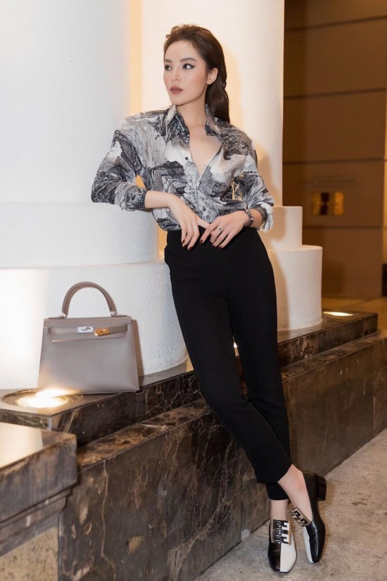 Áo sơ mi kết hợp với quần tây là cách mix thông thường mà bất kỳ ai cũng có thể áp dụng nhưng để tạo nên sự khác biệt, Kỳ Duyên luôn cởi bỏ 2 cúc đầu, cố ý khoe vòng 1 tròn đầy sau nâng cấp.