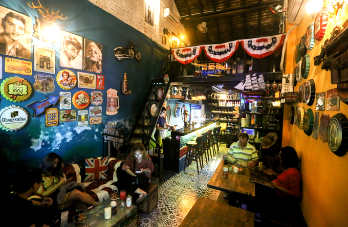Ngôi nhà hai tầng có diện tích hơn 80 m2, được anh Giang thuê lại và trang trí để làm quán cà phê. Không gian được thiết kế theo thiên hướng cổ điển, mô phỏng quán bar của Mỹ trong thế kỷ 18- 19.