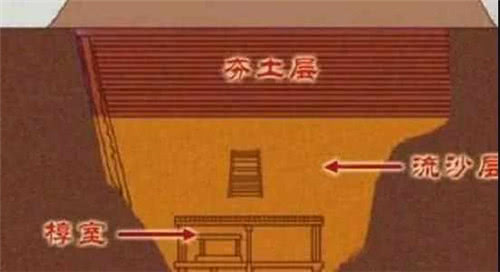 Khi kẻ trộm ngôi mộ đào vào lớp này, bất kể chúng đào xuống như thế nào, chỉ trong thời gian ngắn lượng cát lưu động lớn sẽ lại lấp hết các lỗ mà chúng đào. Ngoài ra, lớp cát dày 13 mét cũng là một cái bẫy thiên nhiên nguy hiểm cho kẻ trộm mộ. Chỉ một chút mất cảnh giác, chúng có thể sa vào đầm cát không thể cứu chữa.