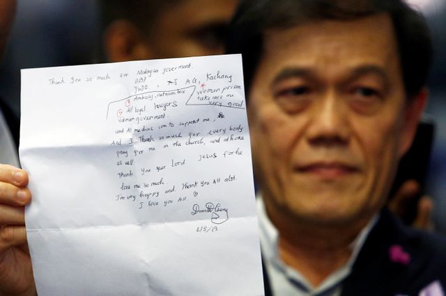Lá thư cảm ơn của Đoàn Thị Hương được luật sư của cô công bố trong buổi họp báo ngày 3/5 (Ảnh: Reuters)