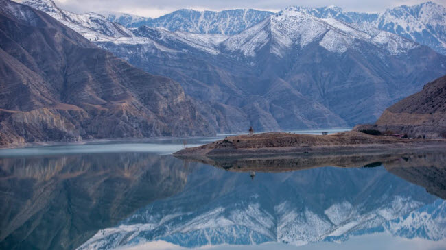 Những đỉnh núi phủ đầy tuyết in bóng xuống hồ Tortum ở Erzurum, Thổ Nhĩ Kỳ.
