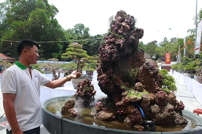 Tác phẩm non bộ có chiều cao 1,6m được đặt trên một khay đá hình e-líp nguyên khối có kích thước 135x205cm.