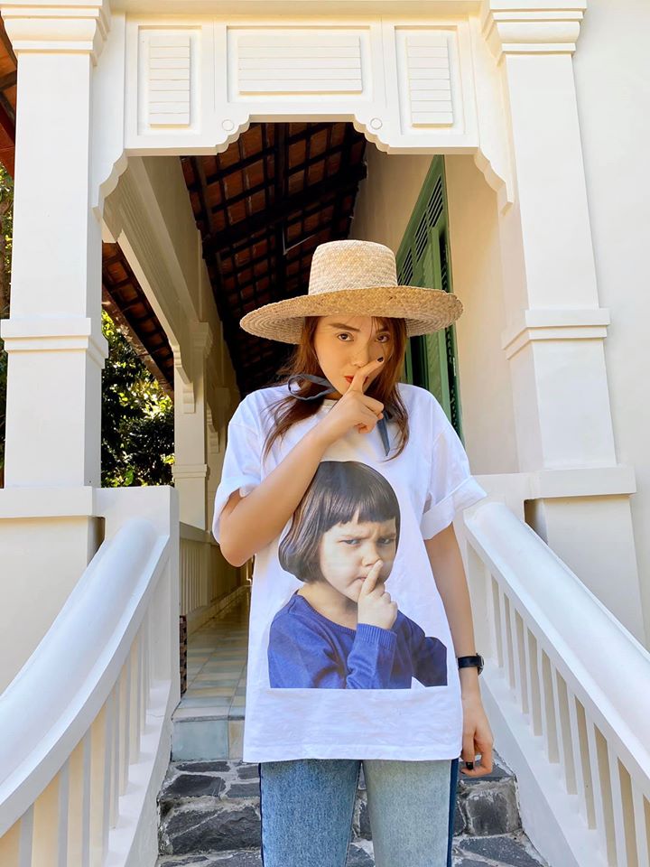 Hoa hậu Kỳ Duyên bắt chước cách tạo dáng như hình em bé được in trên chiếc áo phông cô đang mặc.