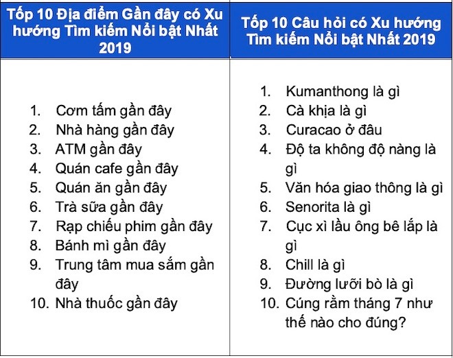 Ngoài ra, tìm địa điểm trong khoảng cách gần là một xu hướng nổi bật năm 2019 khi người Việt ‘hỏi Google’ thường xuyên các địa điểm ở gần như: ‘Cơm tấm gần đây’, ‘Nhà hàng gần đây’, ‘ATM gần đây,… cho đến ‘Rạp chiếu phim gần đây’ hay ‘Nhà thuốc gần đây’. Xu hướng này tạo ra những cơ hội phát triển kinh doanh cho các doanh nghiệp và hộ kinh doanh cá thể bằng việc gia tăng sự hiện diện của mình trên bản đồ Google Maps để khách hàng có thể tìm kiếm đến mình dễ dàng hơn.