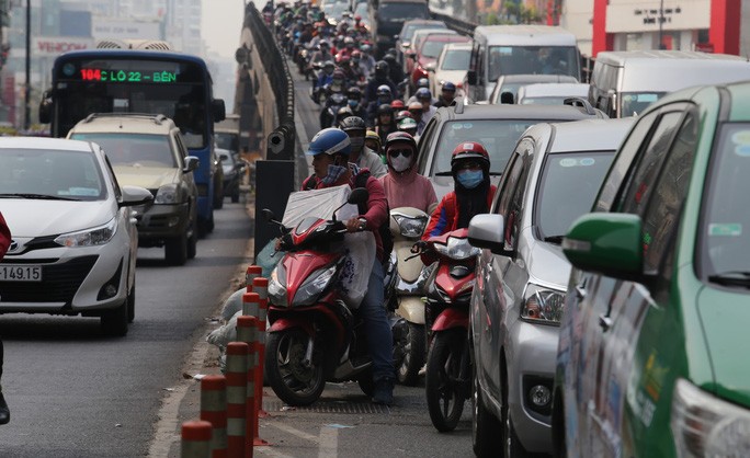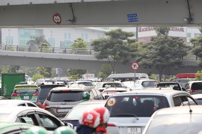 Tình trạng tương tự cũng diễn ra ở tuyến Bạch Đằng - đường một chiều hướng vào sân bay - khi hàng ngàn phương tiện xếp hàng dài, di chuyển chậm chạp.