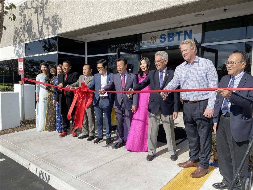 Dân Biểu Hoa Kỳ Alan Lowenthal (thứ ba, từ phải) cùng cắt băng khánh thành cơ sở mới của SBTN tại Garden Grove. (Hình: Đằng-Giao/Người Việt)