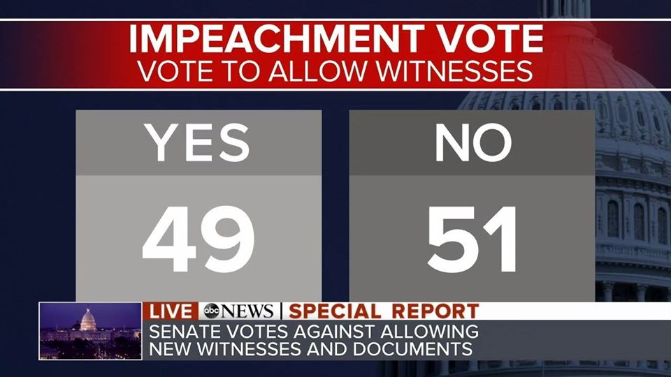 Kết quả bỏ phiếu thỉnh nguyện nhân chứng chủ yếu theo lằn ranh đảng phái với 51 phiếu chống và 49 phiếu thuận như đã dự báo, chỉ có hai Thượng nghị sĩ Cộng hoà Susan Collins (Maine) và Mitt Romney (Utah) đứng về phía Dân chủ, ủng hộ gọi nhân chứng ra khai.