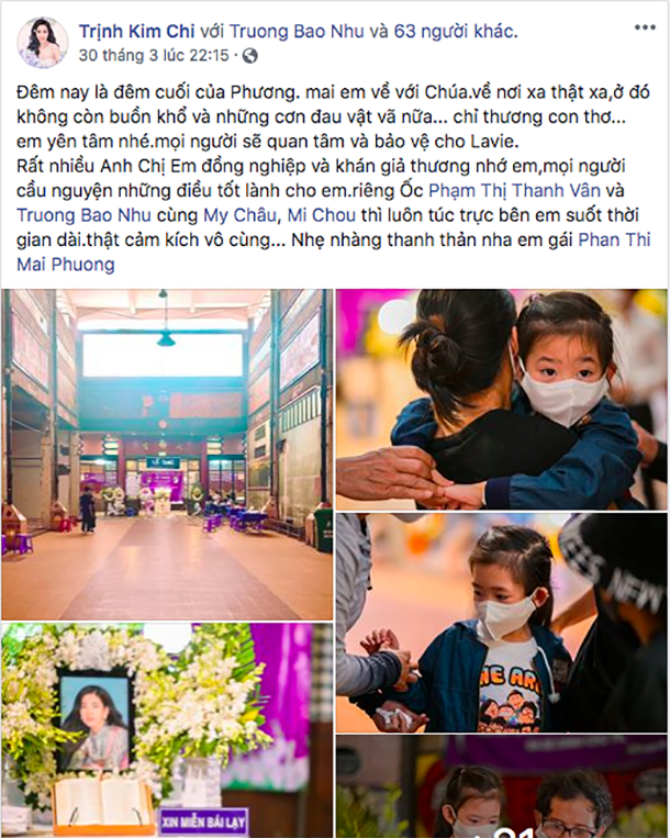 Trịnh Kim Chi là nghệ sĩ cập nhật tình hình từ khi Mai Phương qua đời cho đến thời điểm hiện tại. Cô thể hiện sự đau thương dành cho người em quá cố của mình. Thế nhưng mới đây, nữ diễn viên ‘Thương nhớ ở lại’ – Trà My đã công khai mỉa mai nghệ sĩ Trịnh Kim Chi khi cô luôn tục tỏ ra đau xót trước sự ra đi của Mai Phương.