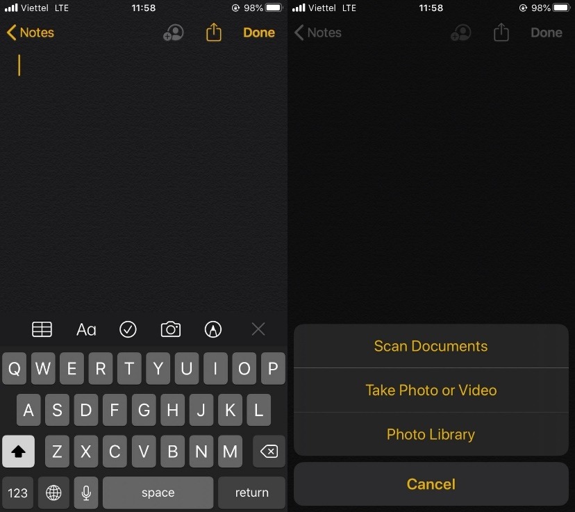Ở trang soạn thảo ghi chú, bạn bấm lên nút hình chiếc máy ảnh và chọn Scan Documents.