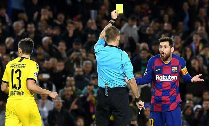 Messi đã có không ít lần nhận thẻ mùa này. Ảnh: Reuters.
