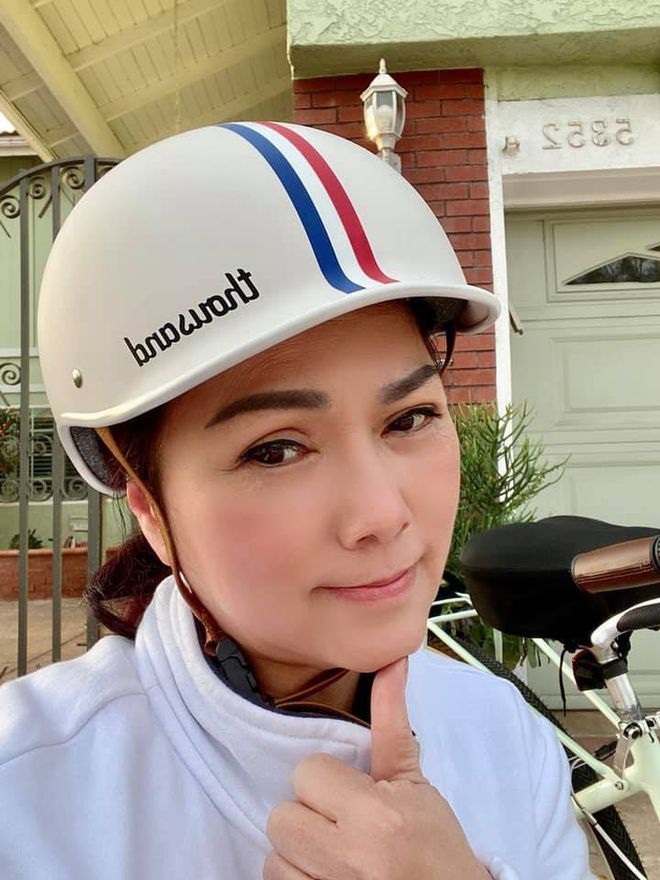 Phương Loan tập lại thói quen đạp xe mỗi sáng.